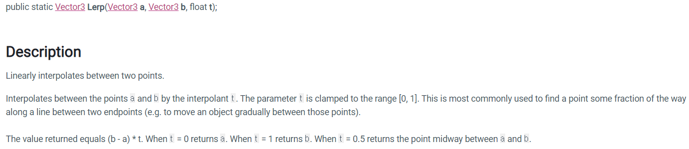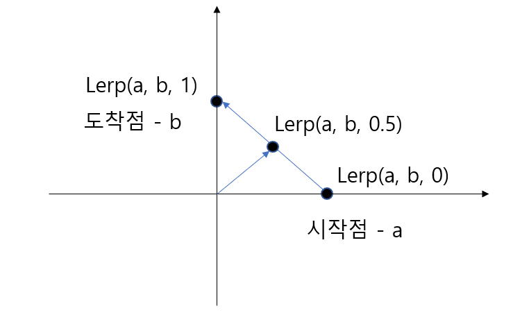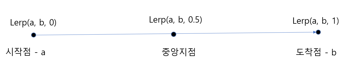 a와 b 사이의 선형보간을 t에 의해서 계산한 후 위치를 반환하며, 파라미터는 0~1의 값을 가지고 1은 endPoint, 0은 startPoint를 의미한다. ( 더 예를 들자면 t가 0.5라면 a와 b를 선형보간한 후 중앙 위치를 반환해 줄 것이다. )