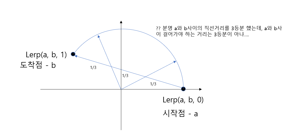 단순히 a와 b 두 점 사이의 거리를 나눠서 위치를 얻는 것이 아닌, a와 b가 구체평면 위에 위치한다고 가정한 후, 호의 거리를 선형적으로 보간해서 위치를 얻어내는 것이다.