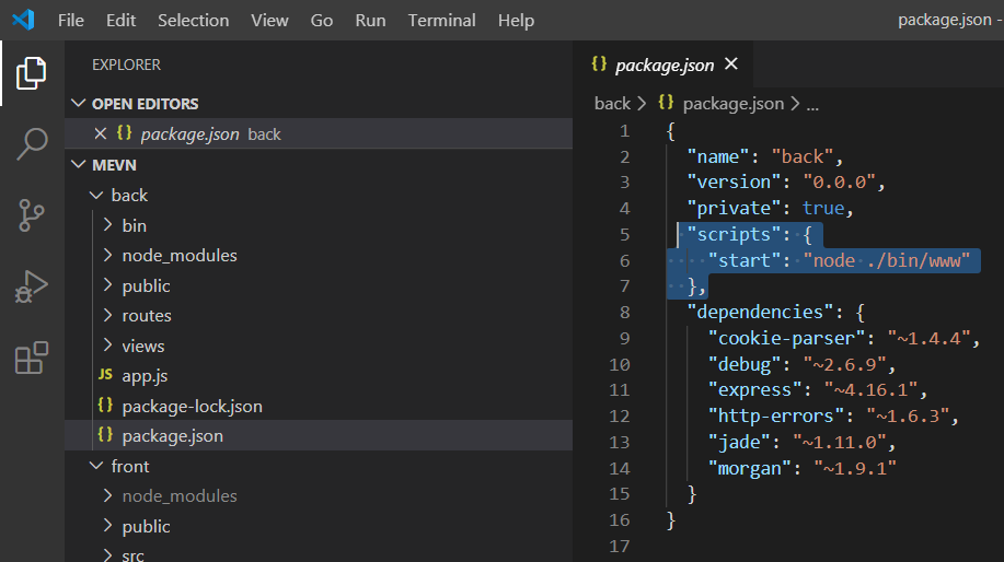 위에서 서버를 실행시킬 때 사용했던 npm start라는 명령은 back/bin/www 파일을 실행하는 하나의 명령어다.