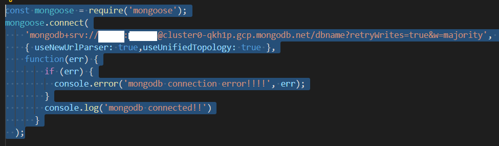 물론 그 위 if문의 mongodb connection error!!!!가 출력되면 뭔가 오류가 발생했다는 뜻이다.