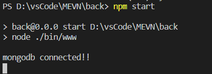 터미널을 실행시키면 위에 우리가 console.log로 추가했던 mongodb connencted!!가 출력되는 것을 볼 수 있다.