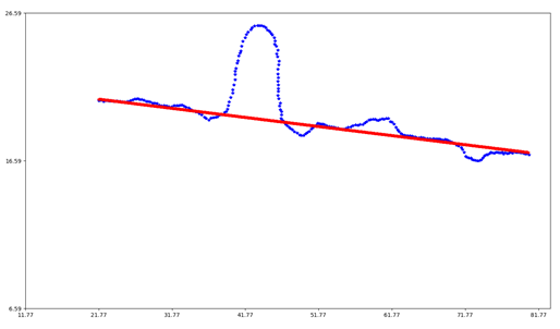 파란색은 노이즈가 섞인 데이터셋이고, 빨간색은 RANSAC을 통해 근사시킨 모델이다.