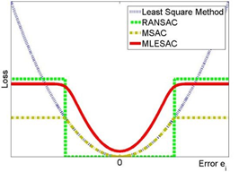 위 사진은 몇몇 모델근사 알고리즘의 loss error 그래프인데, RANSAC의 경우는 에러가 임계값 이하일 때 loss가 0이다.