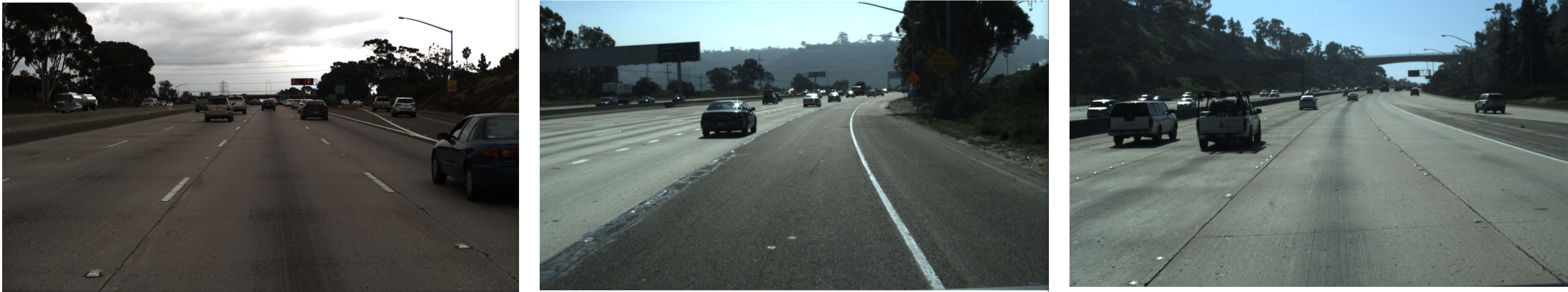왼쪽 사진과 같이 일반적인 도로환경은 물론이고, 가운데 사진과 같은 흐릿한 차선도, 오른쪽 사진과같은 차선없이 요철로 이루어진 구간의 데이터도 존재한다. 하지만 극적인 날씨에 대한 데이터는 없으니 사용에 주의 (비오거나, 밤, 안개낌 등)