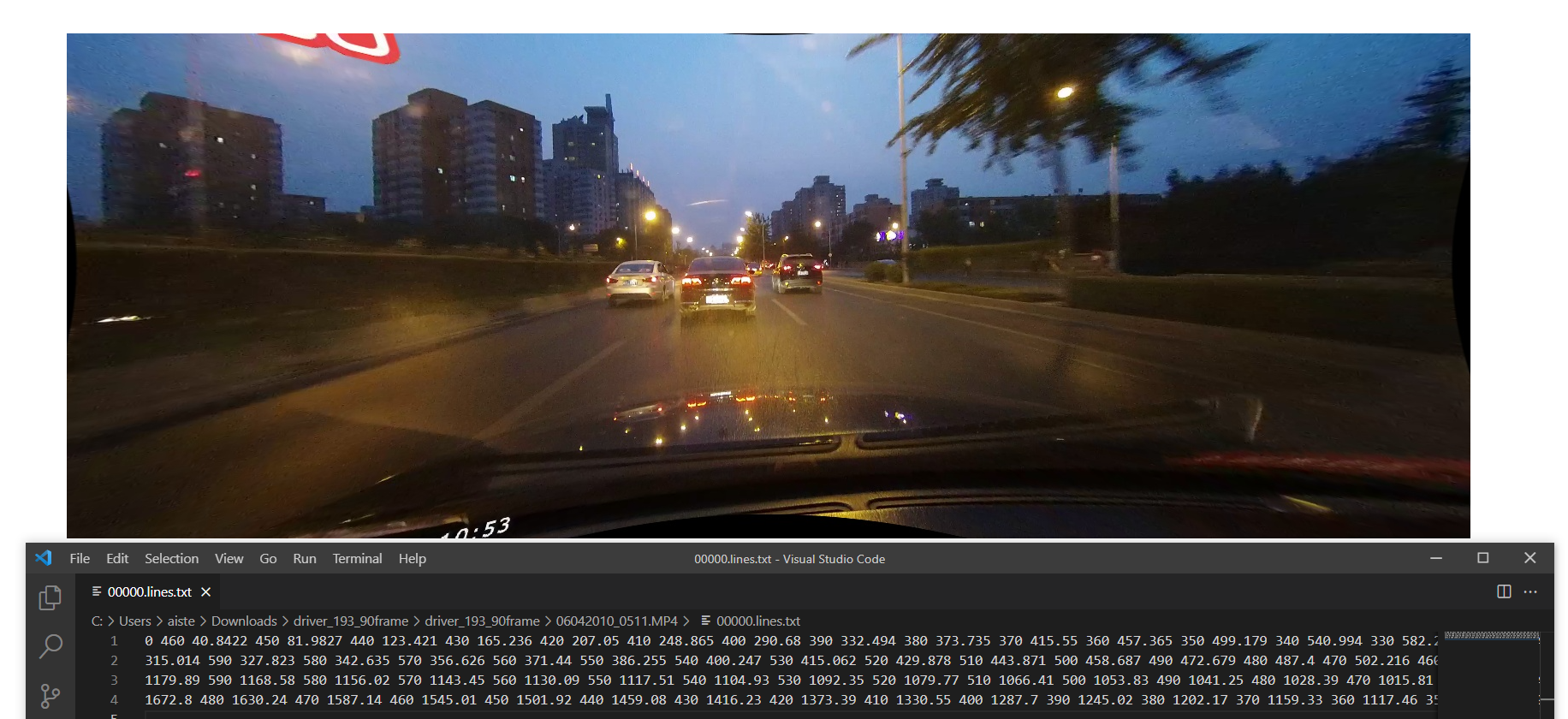픽셀단위로 세그먼테이션되어있지 않고 위와 같은 형태로 되어있다. json도, csv도 아닌 숫자의 나열이기 때문에 사용이 불편. 더 번거로운 것은, 위에서 볼 수 있다시피 정수가 아닌 소수도 존재하는데, 이는 영상에서 차선 위치를 직접 추출한 것이 아니라, 차선을 그린 후 3차 스플라인(cubic spline) 보간으로 얻은 함수를 제공하기 때문.