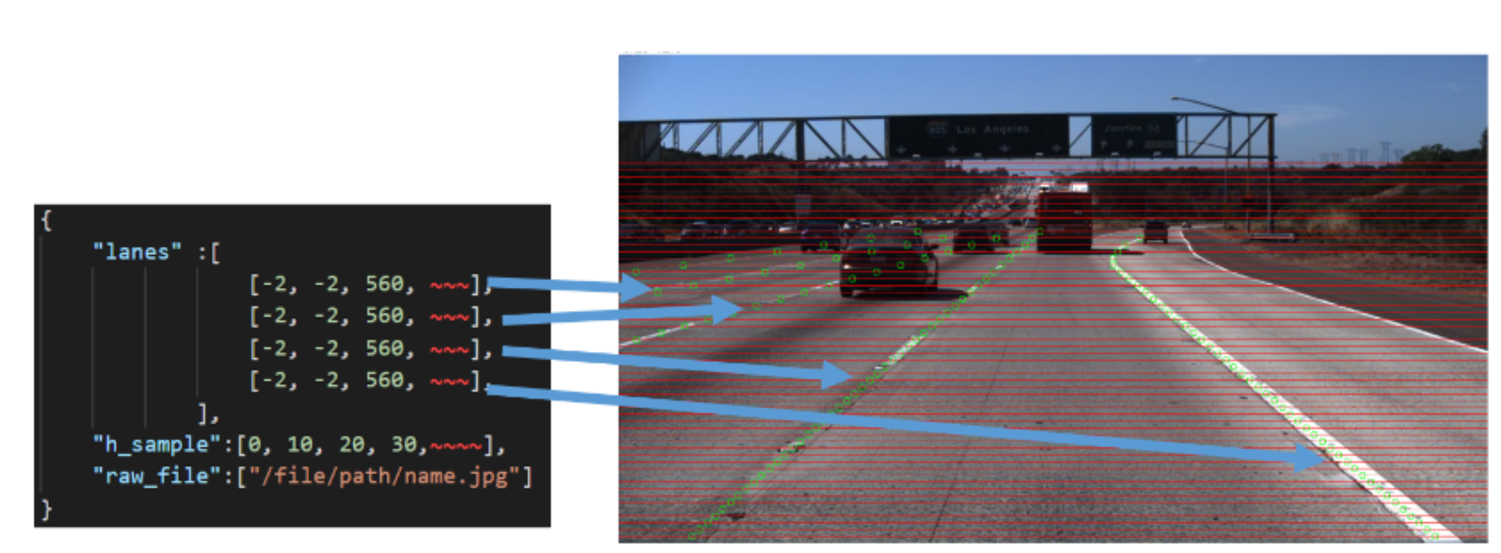 위 왼쪽과 같은 형태로 주어지며, 각 h_sample에 대해 차선이 존재하면 lanes에 기록된다. 즉, lanes의 원소 개수인 4개만큼의 차선 데이터가 있으며, 해당 h_sample 위치에 차선이 존재하면 차선의 width좌표가, 없으면 -2가 기록된다.